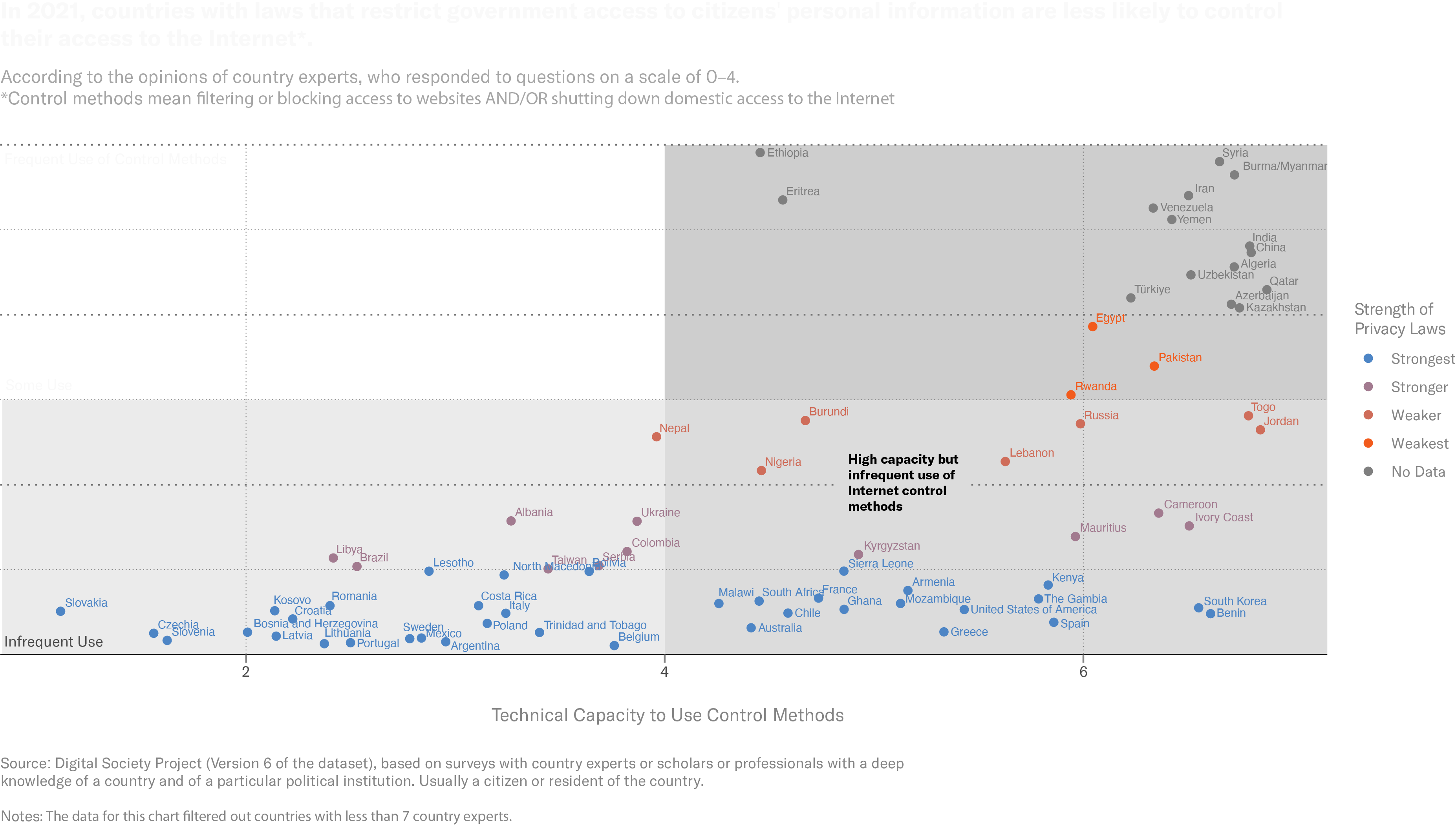 According to expert opinion, countries with stronger privacy laws are less likely to control citizens’ access to the Internet. Perhaps these countries have privacy laws that also explicitly prevent the use of certain control methods, but it may also just reflect a culture of privacy. It’s difficult to know without looking at each individual country’s laws, but it’s reasonable to believe that countries with privacy laws also protect digital media freedom.
