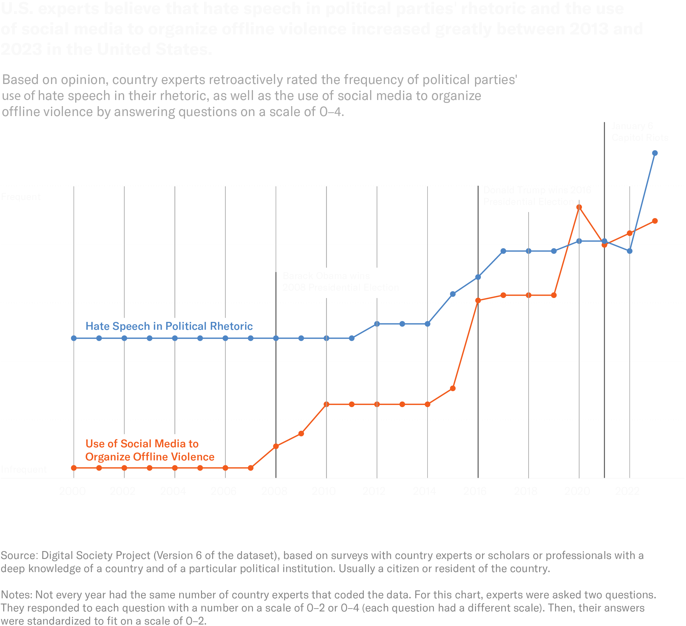 Experts believe that political parties’ use of hate speech8 and the use of social media to organize offline violence has increased overtime9. This does not necessarily mean that instances of offline violence is increasing. In fact, violent crimes seems to be decreasing in the United States overall10, though, some datasets show conflicting or incomplete pictures).11