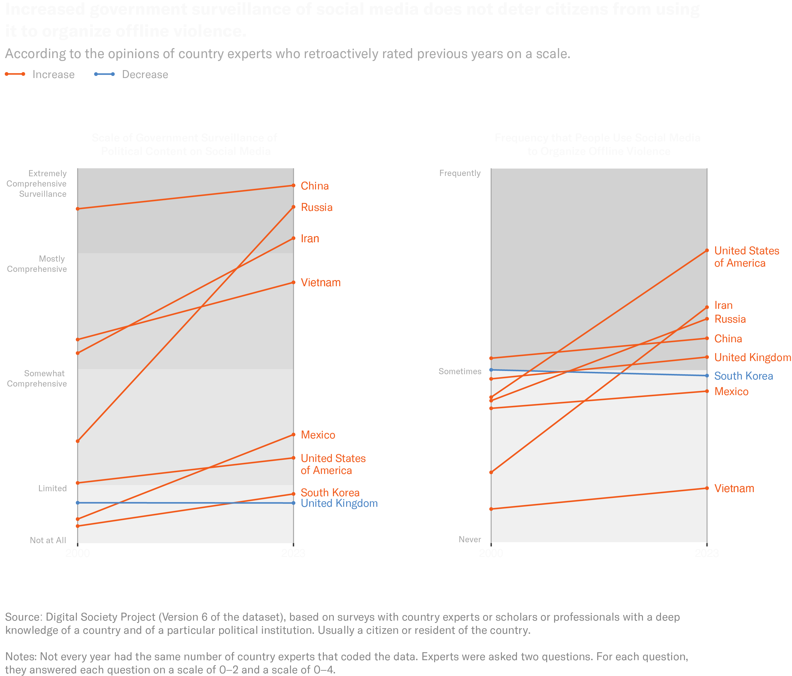 It’s difficult to determine whether government surveillance of social media effectively prevents its use in organizing offline violence, especially given the unprecedented growth and widespread adoption of social media over the past 20 years. And, netizens may not know the extent of government surveillance in order to be deterred from using social media to organize violence.6 With that being said, the data above suggests that even the most authoritarian governments may not deter people from using social media to organize offline violence.