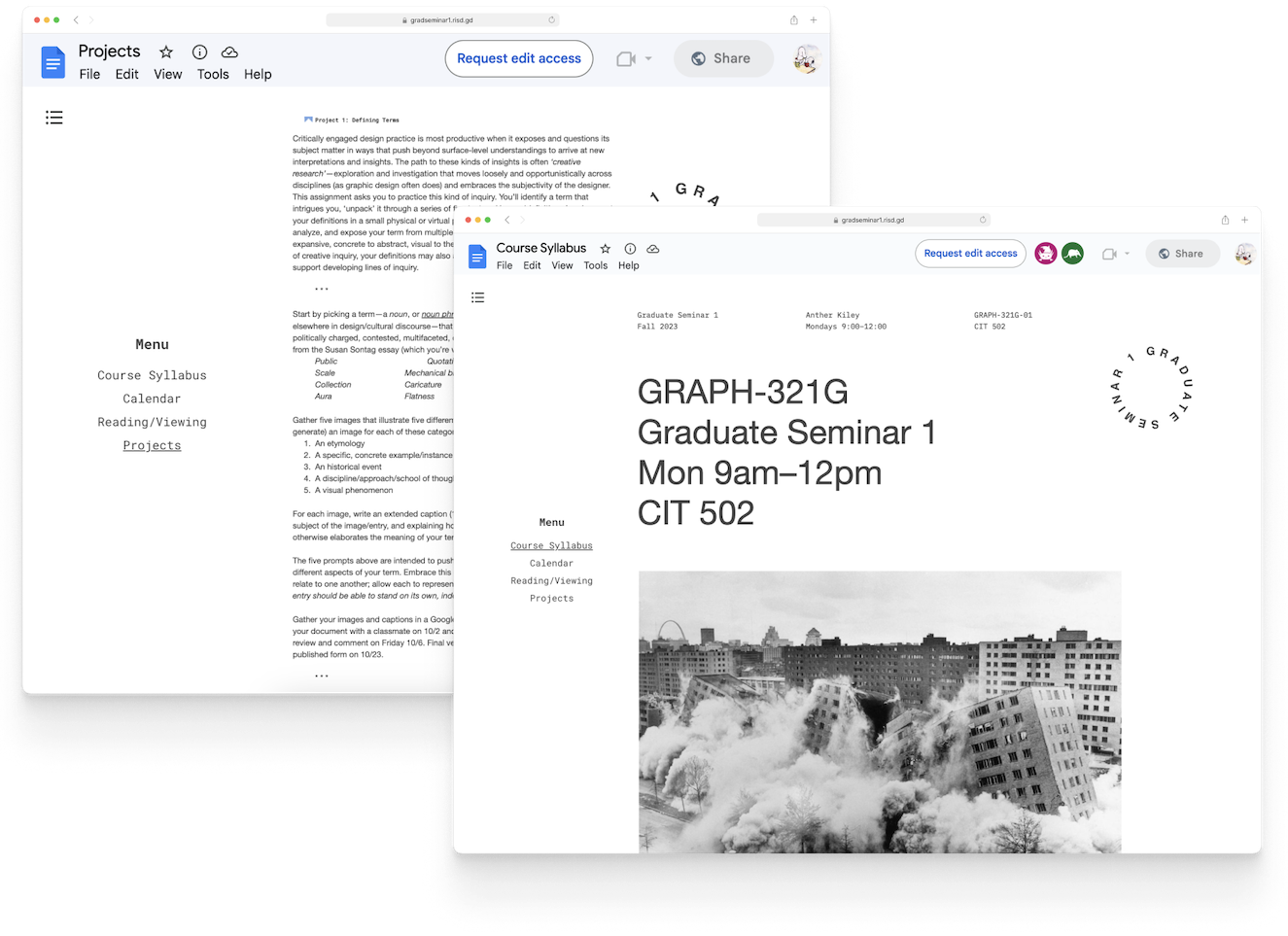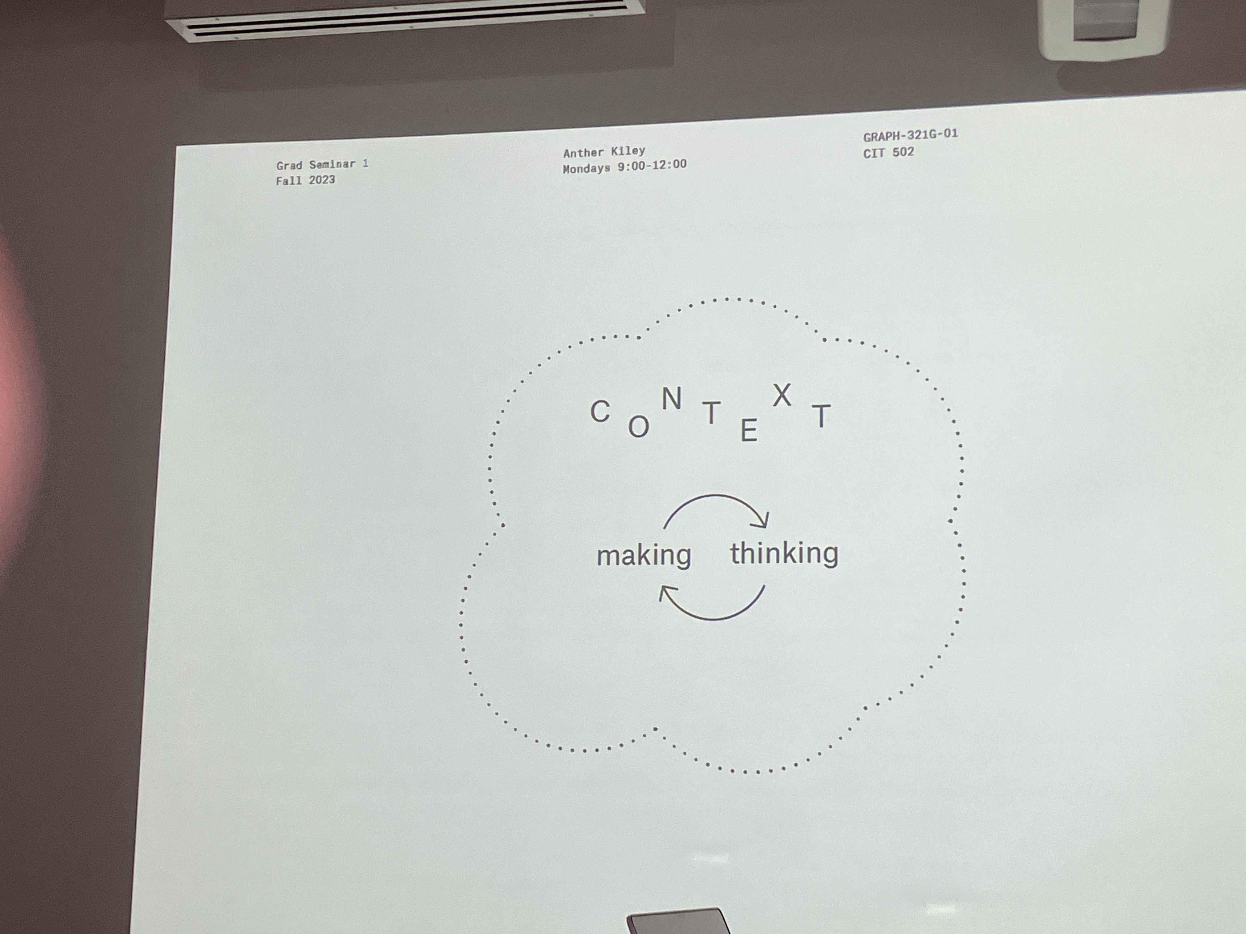 "Critically engaged design practice is most productive when it exposes and questions its subject matter in ways that push beyond surface-level understandings to arrive at new interpretations and insights. The path to these kinds of insights is often ‘creative research’ —exploration and investigation that moves loosely and opportunistically across disciplines (as graphic design often does) and embraces the subjectivity of the designer. This assignment asks you to practice this kind of inquiry. You’ll identify a term that intrigues you, ‘unpack’ it through a series of five text and image ‘definitions,’ and present your definitions in a small physical or virtual publication. Your definitions will untangle, analyze, and expose your term from multiple angles, ranging from the specific to expansive, concrete to abstract, visual to theoretical. In addition to modeling strategies of creative inquiry, your definitions may also act as a catalyst for future research or support developing lines of inquiry."